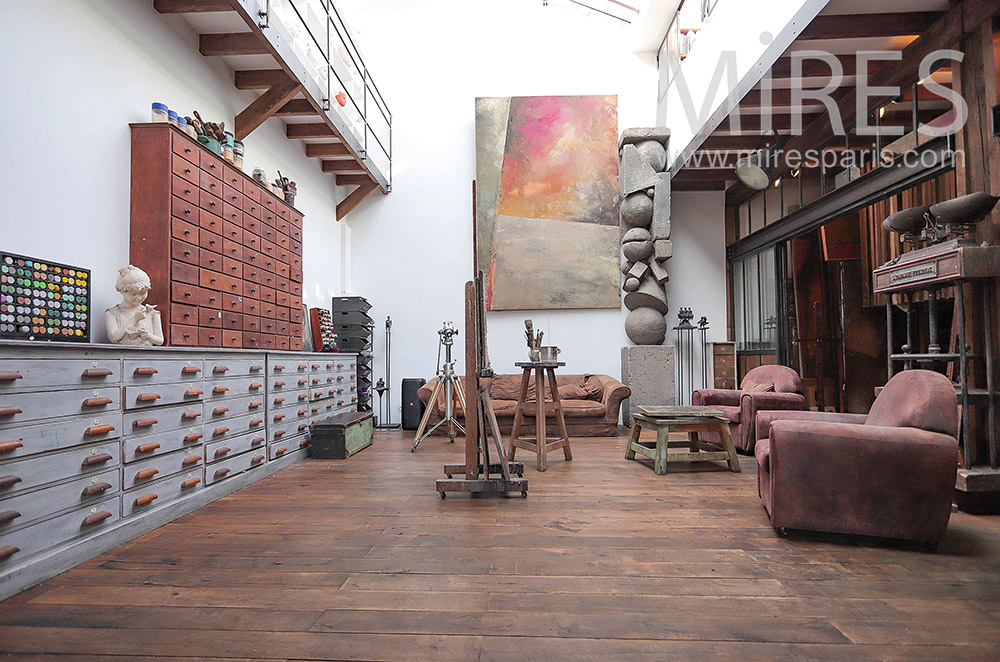 C2159 – Salon atelier d’artiste Visite rapide Visite complète Visite par pièce Île-de-France EntréeAtelierBibliothèqueCuisine ouverteBureauCuisineChambreSalle de bain