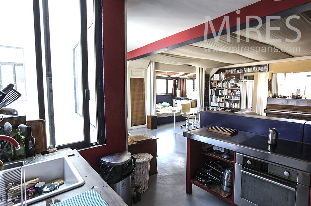 C0449 – Cuisine rouge bordeaux Visite rapide Visite complète Visite par pièce Paris RooftopSalonCuisineBureauSalle de bainEscalierChambreRooftopEntrée