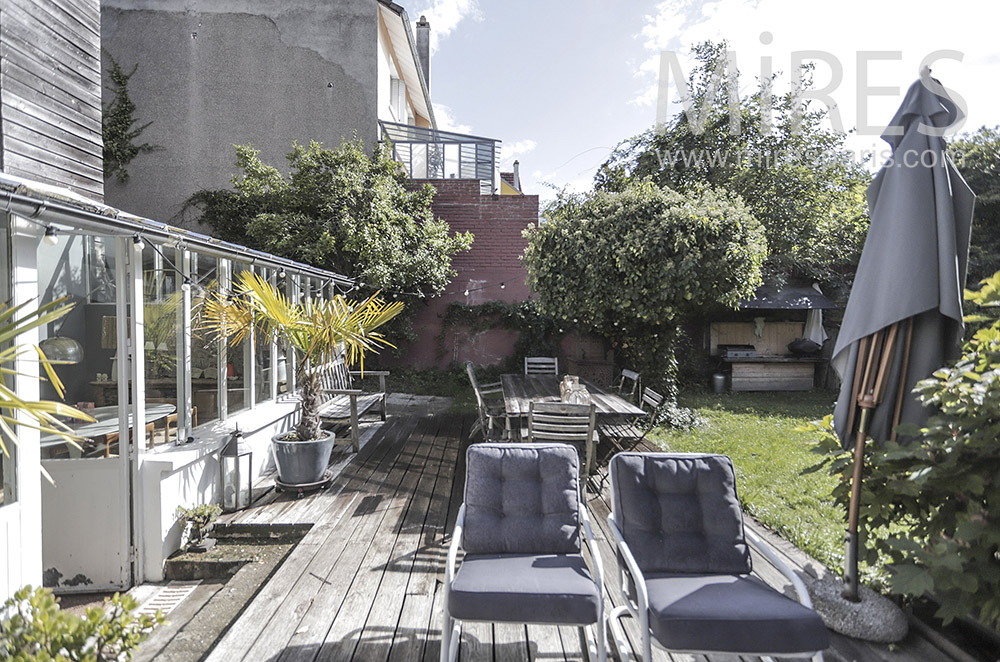 C1945 – Grande terrasse en bois Visite rapide Visite complète Visite par pièce Île-de-France Salle à mangerSalonCuisineEscalierBibliothèqueChambreSalle de bainChambreBuanderieSerre et véranda