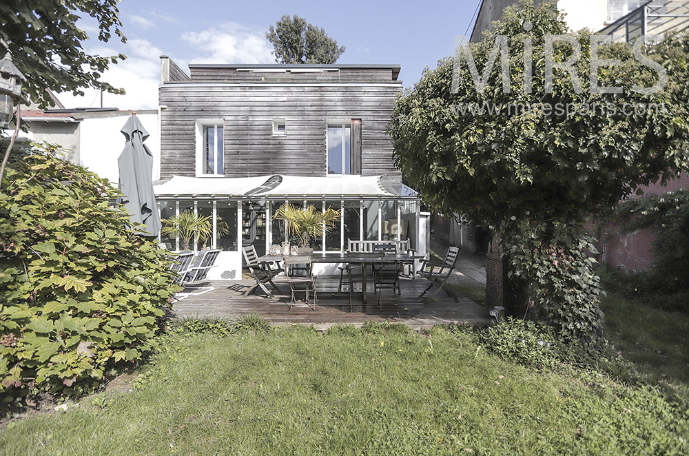C1945 - Maison contemporaine avec véranda Visite rapide Visite complète Visite par pièce Île-de-France Salle à mangerSalonCuisineEscalierBibliothèqueChambreSalle de bainChambreBuanderieSerre et véranda
