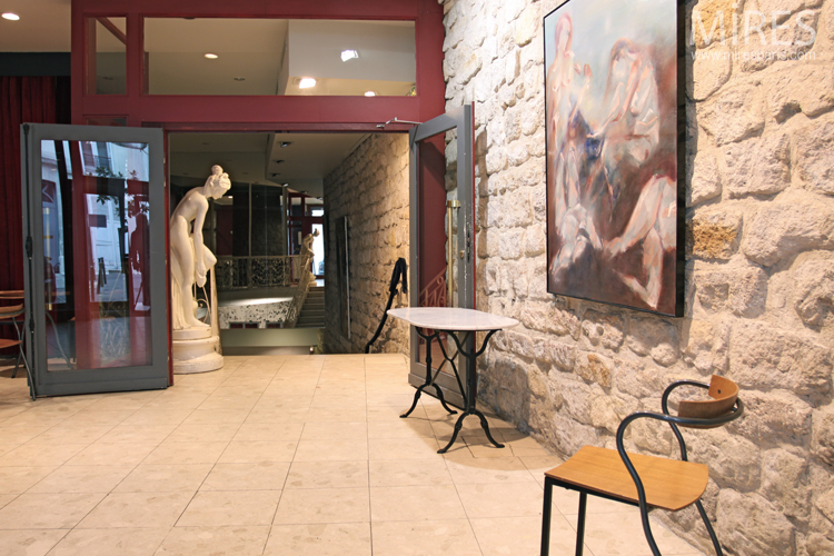 C0685 – Red and beige reception area with cafetaria Visite rapide Visite complète Visite par pièce Paris StaircaseCafeteriaEntry