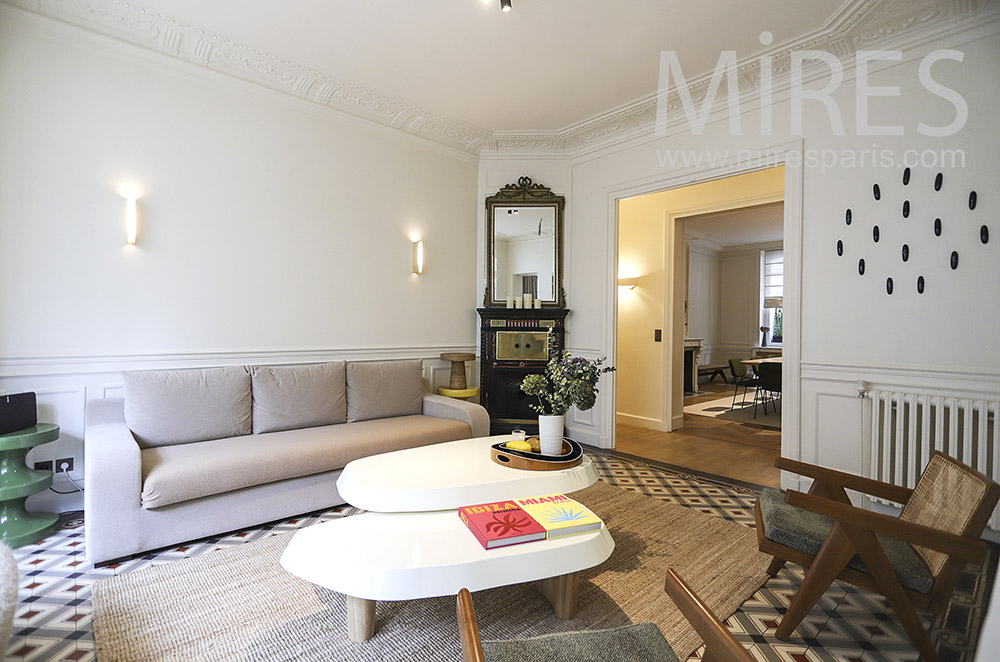 C1879 – Salon épuré, véranda blanche Visite rapide Visite complète Visite par pièce Paris SalonSalle à mangerCuisineChambreSalle de bainChambreTerrasse
